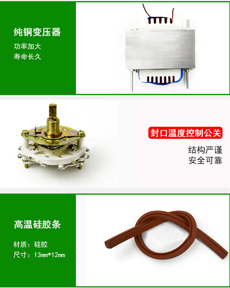 - 封口部件:主要包括封口模具,其形狀和材質會因封口類型和包裝材料的不同而有所差異。對于普通的塑料薄膜封口,模具通常是平面的,材質多為耐高溫的金屬,如不銹鋼。這樣的設計可以保證在加熱和壓力作用下,使包裝材料很好地融合在一起。