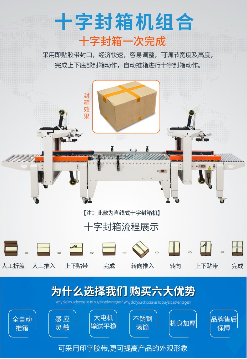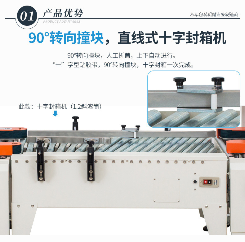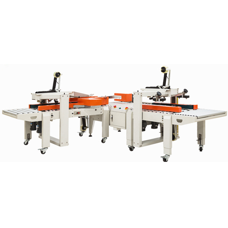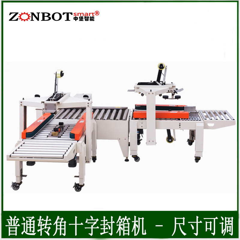 - 十字封箱機:結構更復雜。除了基本的輸送帶系統和一字封箱機構外,還需要有紙箱旋轉機構或者能改變膠帶粘貼方向的特殊裝置。例如,旋轉機構可能包括旋轉電機、旋轉平臺和定位傳感器等部件,以確保紙箱能夠準確地旋轉 90 度。