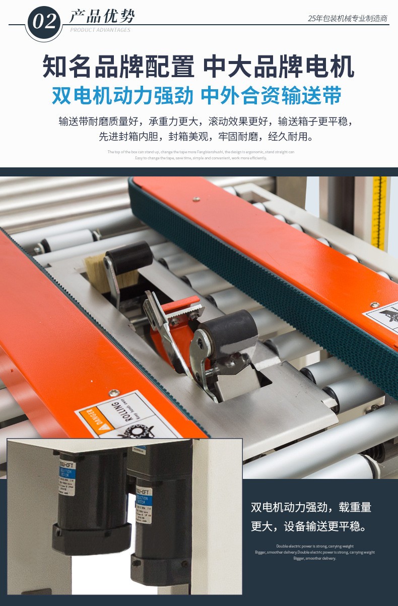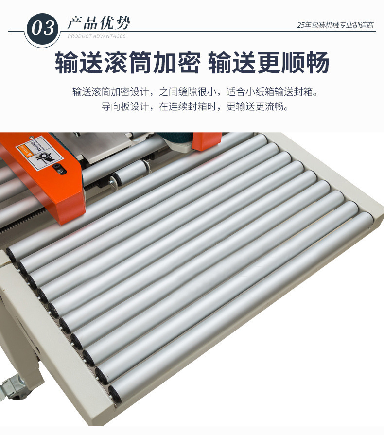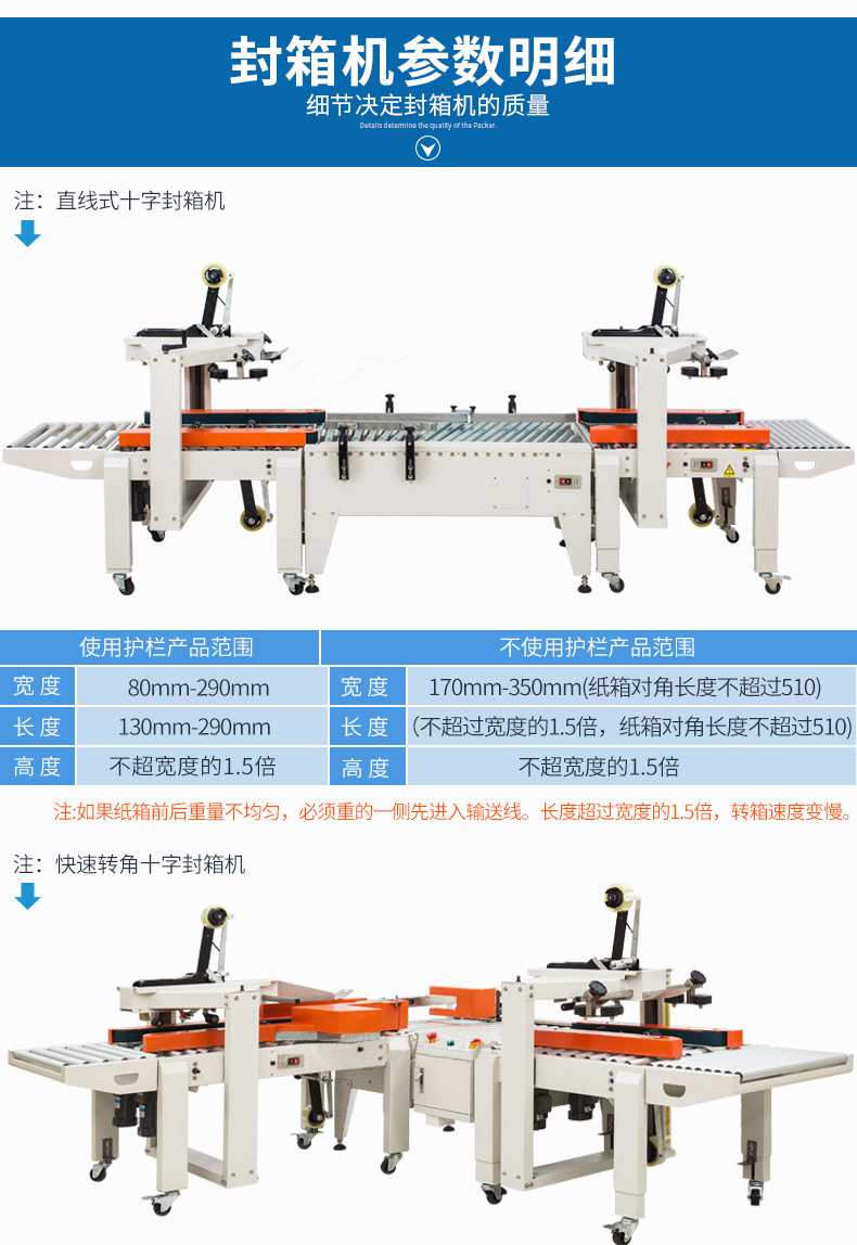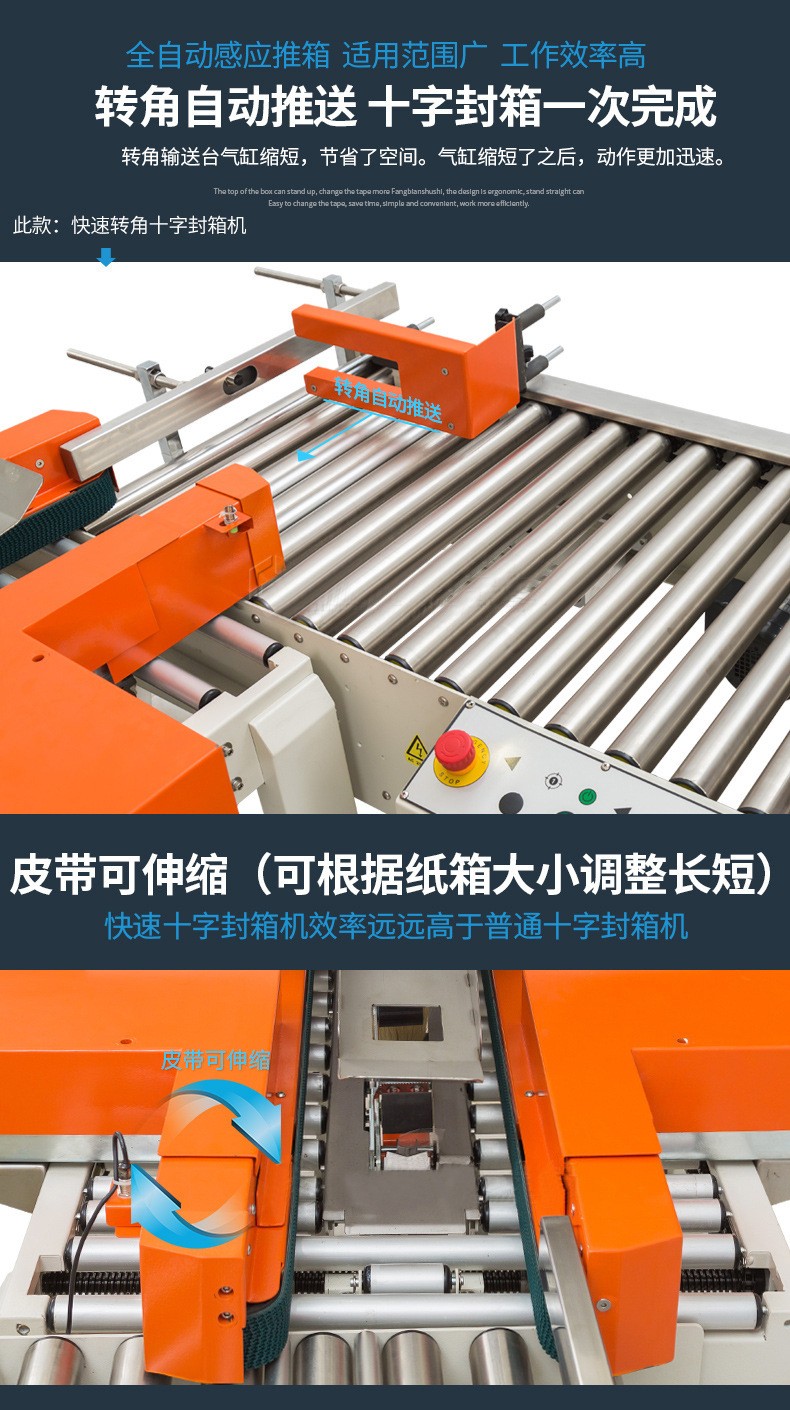 - 十字封箱機:結構更復雜。除了基本的輸送帶系統和一字封箱機構外,還需要有紙箱旋轉機構或者能改變膠帶粘貼方向的特殊裝置。例如,旋轉機構可能包括旋轉電機、旋轉平臺和定位傳感器等部件,以確保紙箱能夠準確地旋轉 90 度。