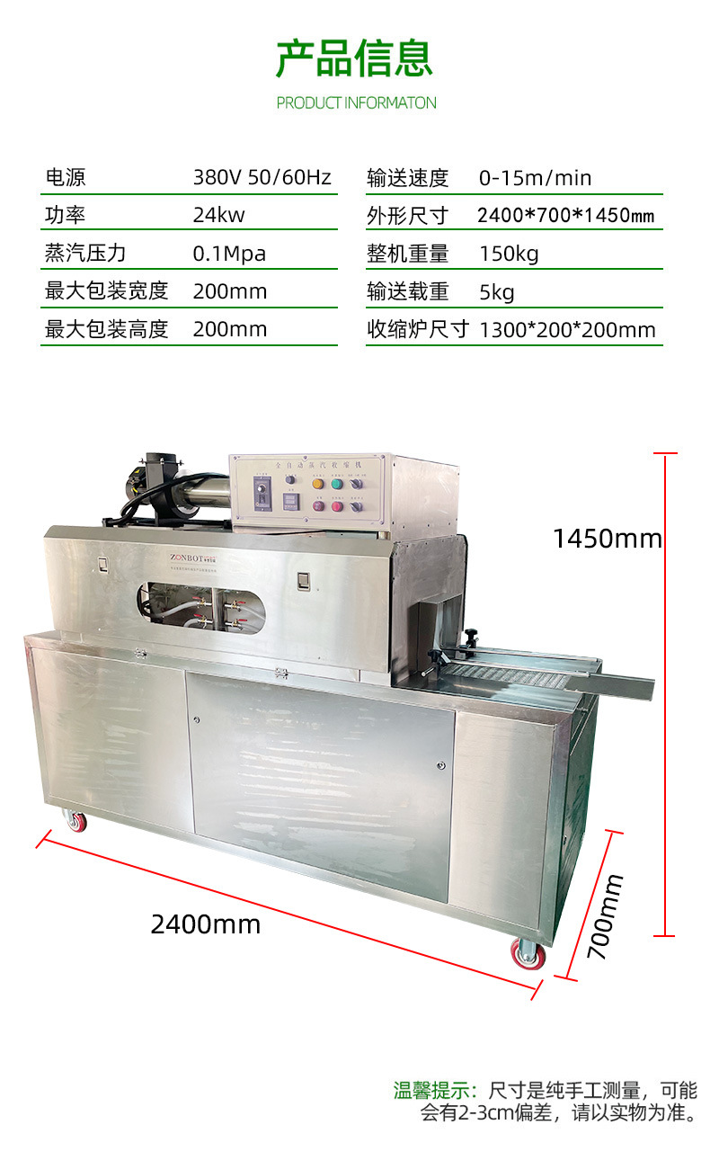 蒸汽收縮機是新一代收縮膜機,設計精巧, 外型美觀,不占空間,移動,安裝迅速快捷,超大范圍的調節,使其可適用于各種輸送帶和滑道。