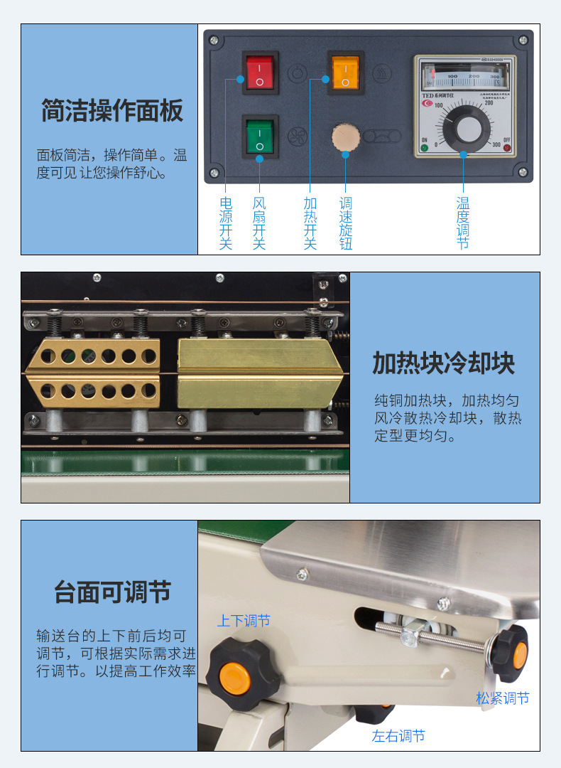 - 輸送原理:其輸送系統是保證連續封口的關鍵。一般由電機、傳動帶(或傳動鏈)和滾輪等組成。電機提供動力,通過傳動裝置帶動滾輪或傳送帶運動。包裝材料放置在傳送帶上或者由滾輪帶動,以一定的速度連續地向封口位置移動。輸送速度是可以調節的,這取決于包裝材料的類型、厚度以及封口的要求等因素。例如,較厚的包裝材料可能需要較慢的輸送速度,以確保封口處有足夠的時間來完成熱封過程。