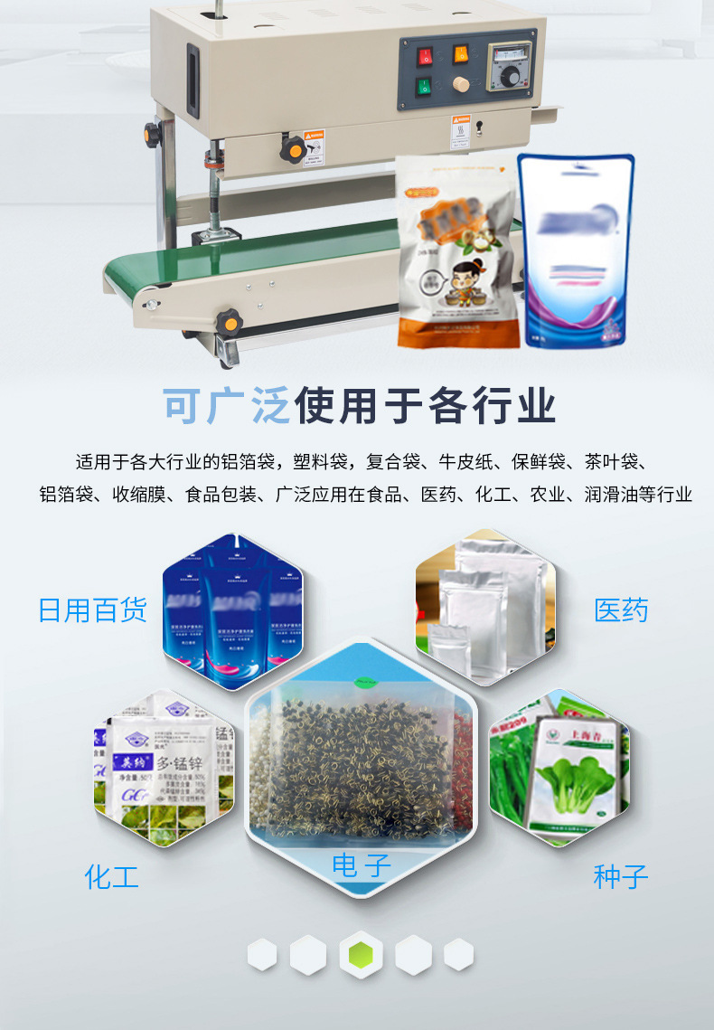 - 適應性強:它能夠適應多種包裝材料,如 PVC、PE、PP 塑料薄膜、鋁箔以及各種復合材料等。同時,對于不同形狀(如扁平的、管狀的)和尺寸的包裝材料也有很好的適應性。只要包裝材料的物理特性在設備的允許范圍內,都可以進行有效的封口。