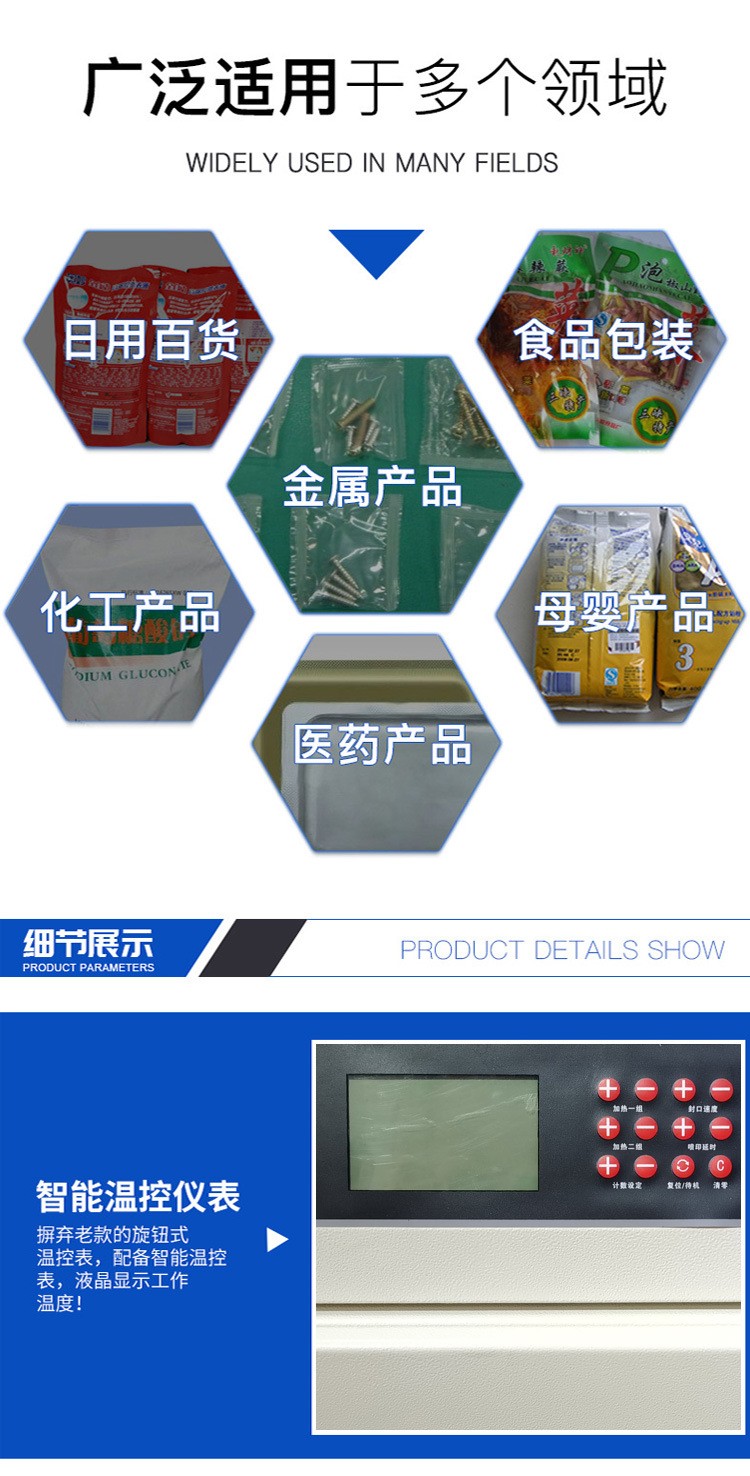 - 食品行業(yè):在食品行業(yè)應(yīng)用最為廣泛,用于各類(lèi)食品的包裝封口,如餅干、薯片、糖果等小零食的包裝袋封口,以及肉類(lèi)、海鮮、蔬菜等食品的真空包裝封口。可以保證食品的新鮮度和安全性,延長(zhǎng)食品的保質(zhì)期。