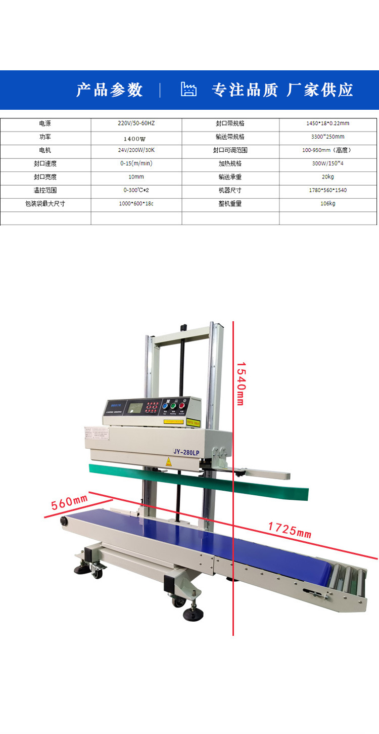 - 封口質(zhì)量穩(wěn)定:由于可以精確控制封口溫度、壓力和速度等參數(shù),連續(xù)式封口機(jī)能夠確保封口質(zhì)量的一致性和穩(wěn)定性。封口牢固、平整,密封性良好,能夠有效防止包裝內(nèi)容物泄漏、受潮或受到污染。在醫(yī)藥和化工等對(duì)包裝質(zhì)量要求較高的行業(yè),這種穩(wěn)定的封口質(zhì)量尤為重要。