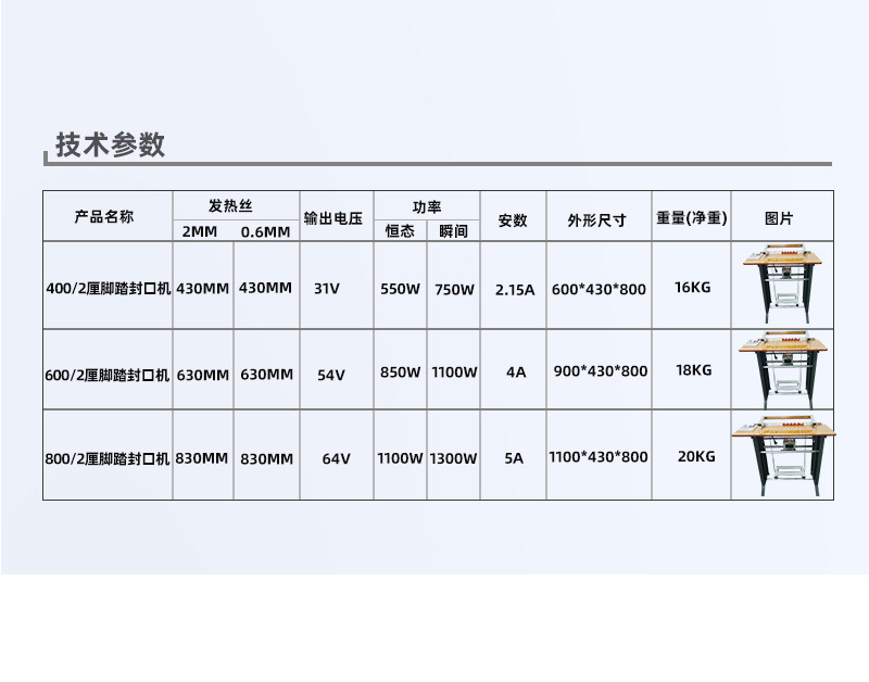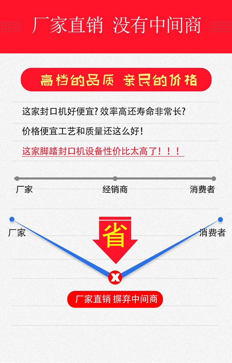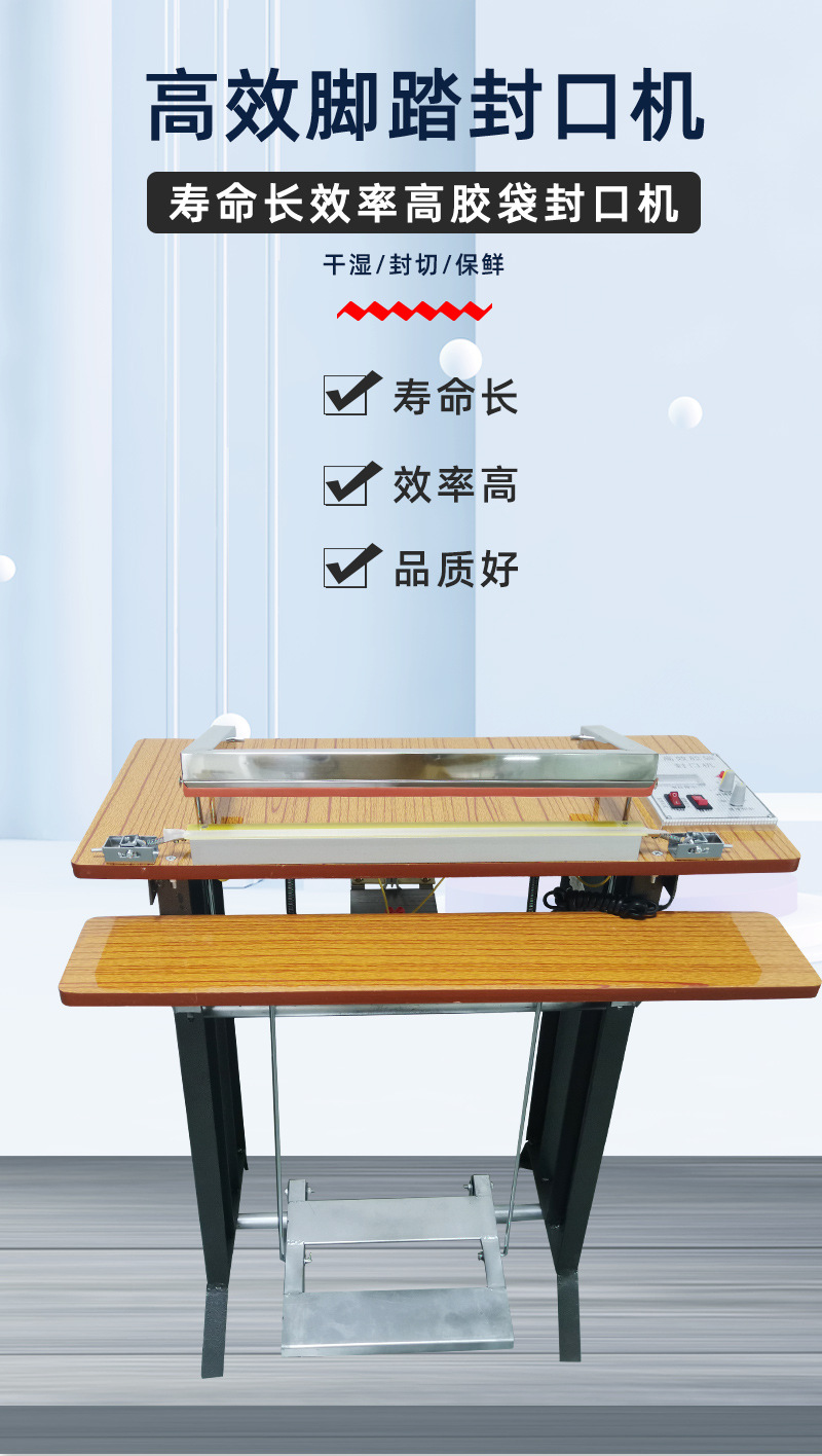 - 操作簡單方便:通過腳踏方式控制封口動(dòng)作,操作直觀、容易掌握。不需要復(fù)雜的電氣控制知識(shí),操作人員可以快速上手。這種簡單的操作方式尤其適合小型企業(yè)、商鋪或家庭作坊等對(duì)包裝設(shè)備操作要求不高的場所。