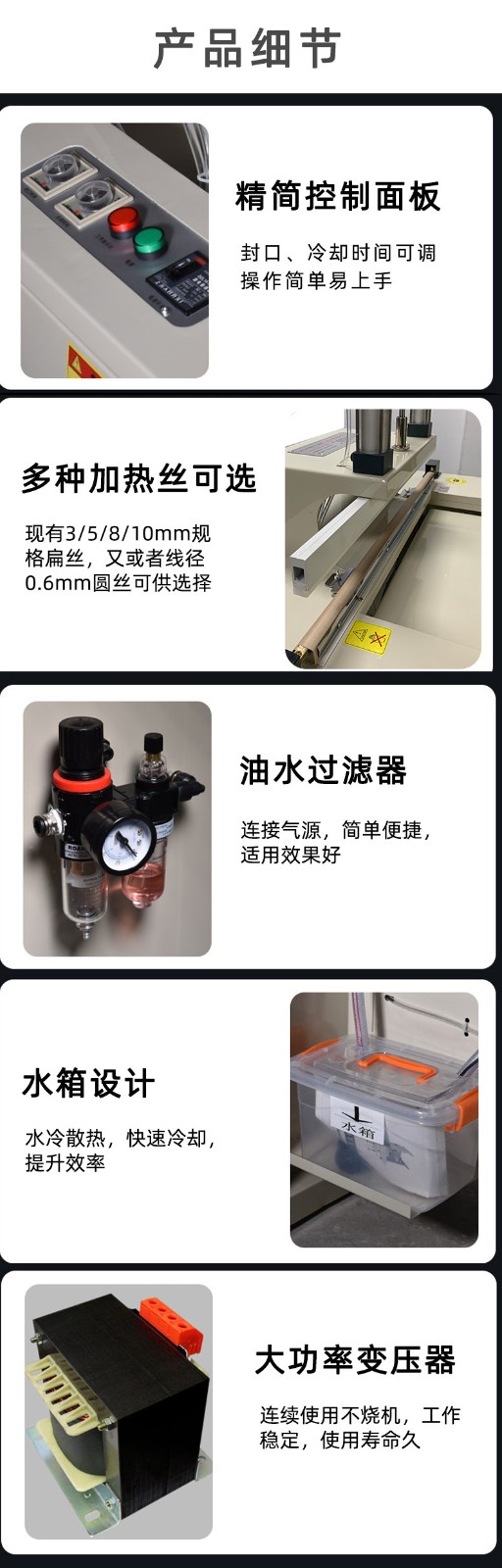 - 工作結束后,先關閉設備的電源,然后讓水冷系統繼續運行一段時間,以確保封口裝置充分冷卻。之后,清理機器表面的灰塵和包裝材料殘渣,檢查冷卻管道是否需要清洗,以及封口裝置是否需要進行保養(如更換封口條、清潔加熱絲等)。