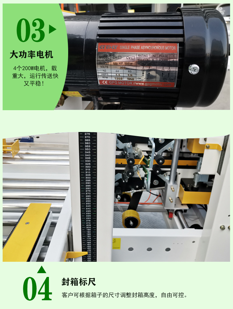 - 適應性強:得益于調節裝置,能夠輕松應對不同大小、長寬高各異的紙箱,滿足多樣化的包裝需求,減少了因紙箱規格變化而頻繁更換設備的麻煩。
