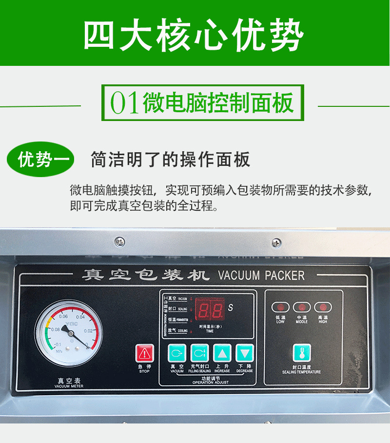 - 操作簡便:設備的控制面板設計簡潔直觀,各項參數調節(jié)一目了然,操作人員無需復雜培訓,即可快速上手,輕松完成真空包裝任務。