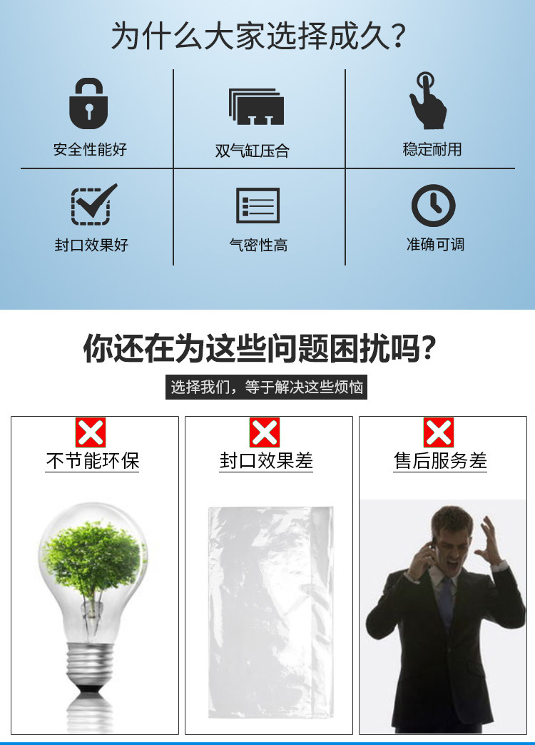 相反,當面對較厚的包裝材料,像是多層復合膜或較厚的塑料材質時,較低的氣壓無法讓封口模具有效壓緊材料,會導致封口不牢。這種情況下,需要提高氣壓,使氣缸推動封口模具產生足夠的下壓力,確保包裝材料的各個層面緊密貼合。同時,適當延長封口時間,給予加熱元件充足時間將熱量傳遞至材料內部,使內層材料也能充分熱熔,進而形成牢固且密封良好的封口。