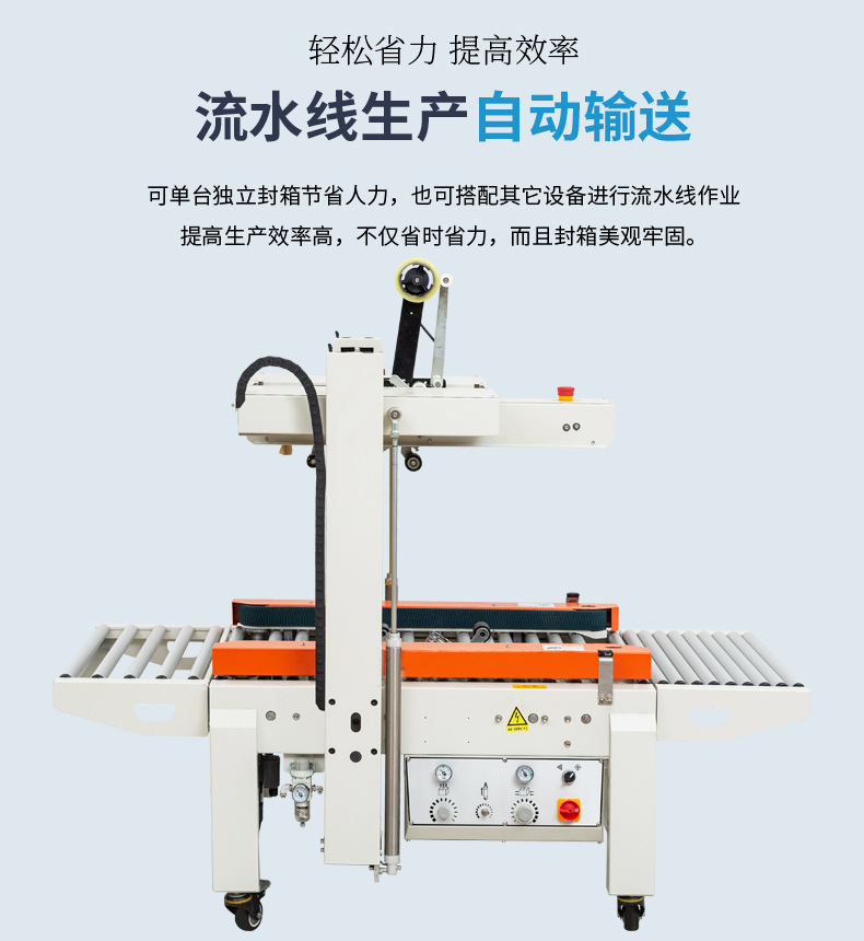 - 啟動封箱機(jī):開啟封箱機(jī)的電源開關(guān),啟動輸送帶和封箱裝置。輸送帶會帶動紙箱向前移動,當(dāng)紙箱到達(dá)封箱位置時,封箱機(jī)的膠帶分配器會自動將膠帶粘貼在紙箱的封口處,并通過壓合裝置將膠帶壓合牢固,完成封箱操作。