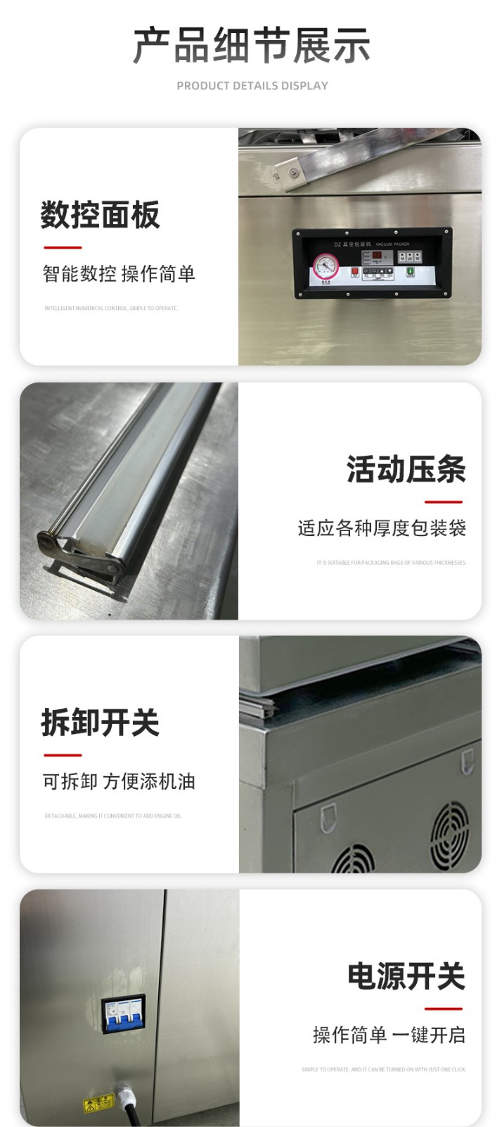 - 材質(zhì):優(yōu)質(zhì)品牌通常采用 304 不銹鋼制作機身和真空室,如諸城冠通機械的 600 型素肉雙室真空包裝機,其真空室采用超厚 304 不銹鋼板,厚度達 4mm,長期使用不變形、不漏氣13。而一些低價品牌可能使用普通不銹鋼甚至是鐵材質(zhì)外包不銹鋼皮,容易生銹腐蝕,影響機器壽命和包裝質(zhì)量。