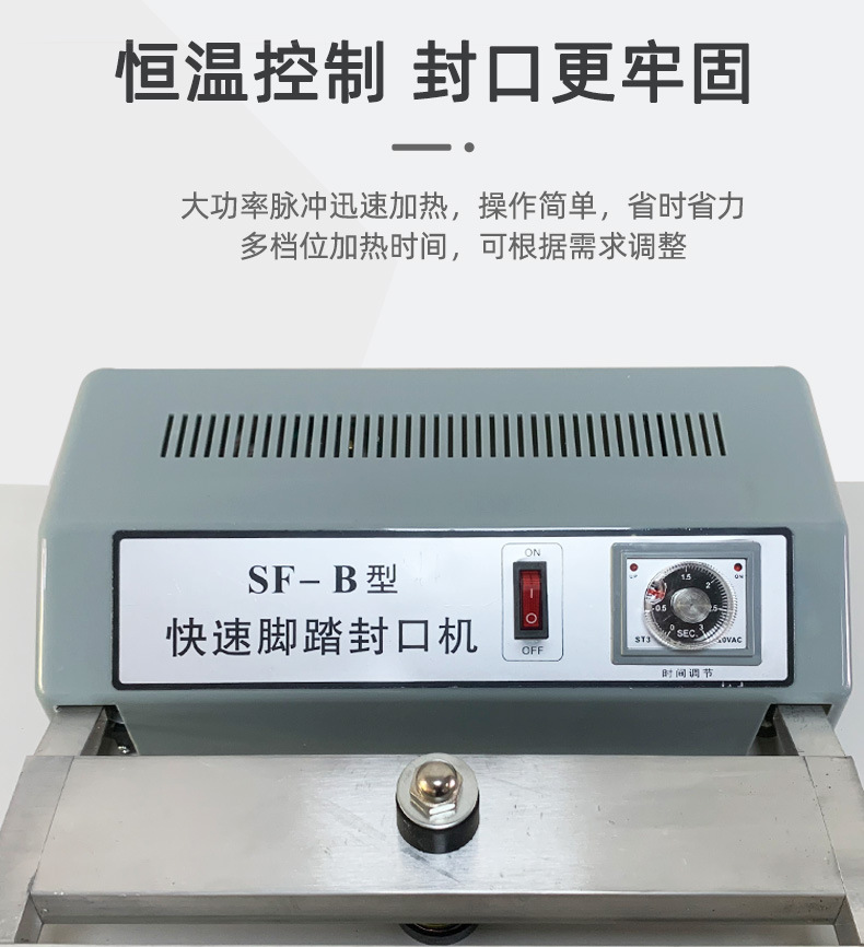 此外,?腳踏封口機還適用于各種塑料薄膜、?復合薄膜及鋁塑薄膜的封合,?廣泛應用于食品、?土特產、?糖果、?茶葉、?醫藥、?五金等行業。?這種設備的操作簡單,?加熱時間可調,?接通電源即可工作,?使得它在商店、?家庭、?工廠等環境中成為方便且經濟的封口解決方案