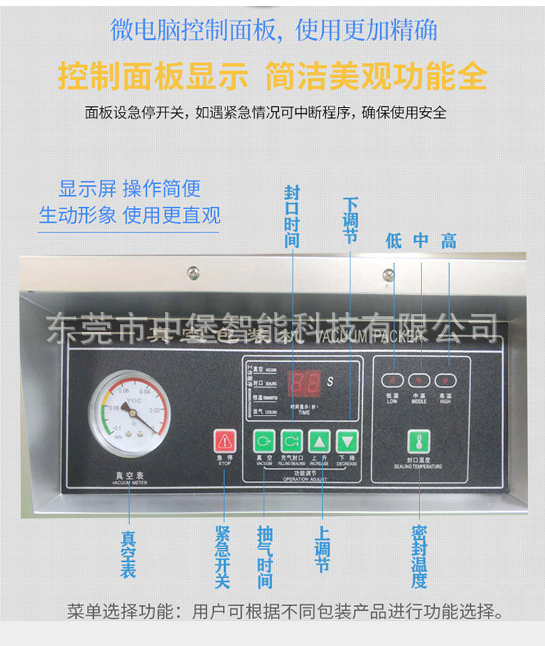 真空包裝機能夠自動抽出包裝袋內的空氣,達到預定真空度后完成封口工序。亦可再充入氮氣或其它混合氣體,然后完成封口工序。真空包裝機常被用于食品行業,因為經過真空包裝以后,食品能夠抗氧化,從而達到長期保存的目的。