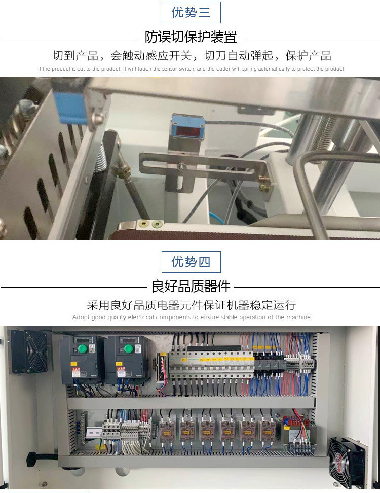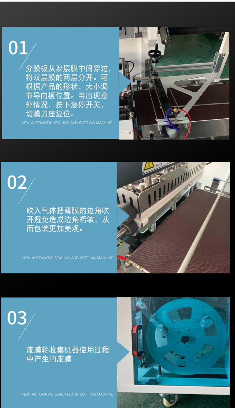 全自動L型封切機是以對折膜為原料材,自動輸送封切后進入熱收縮機.他不同于L.型封切機的穿膜方法.收縮機的穿膜過程包括膠膜放置的兩部分,導膜方膠膜放置膠膜的A面垂直延伸和三角板的D點約為50 mm,如果膠膜的寬度發生變化,放松固定螺釘C,膠膜寬度降低,靠桿向右;增加膠膜寬度,靠桿向左; 放好膠膜,靠桿靠近膠膜B面,鎖緊固定螺釘。 導膜方式:調整滾輪手柄向下,拉動上滾輪,分離下滾輪,橡膠膜穿過滾輪之間的間隙,拉至a處打開橡膠膜,按順序向上滾動,分離下三角板,將上下橡膠膜向前拉至前輸送臺末端,將其向上推回手柄,