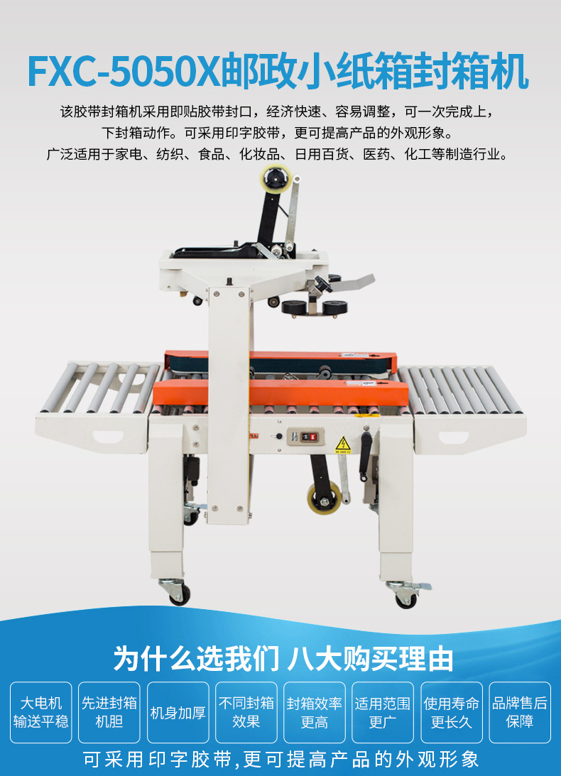 封箱機主要適用于紙箱的封箱包裝,既可單機作業,也可與流水線配套使用,它可單箱作業,也可與紙箱成型開箱機、裝箱機、貼標機、捆包機、棧板堆疊機、輸送機等設備配套成包裝流水線使用,為包裝流水線作業必須的設備。